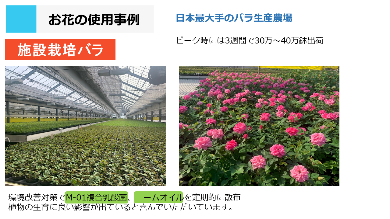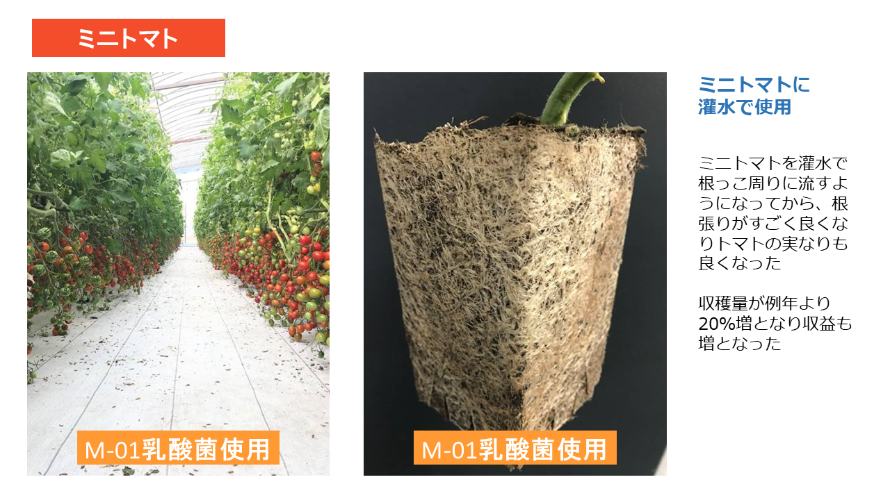 M-01の働きで肥料の吸収が良くなり、農薬等の使用回数が減った結果、作物のえぐみが減り、旨味向上・糖度向上につながります。有機肥料との併用はさらに効果的です。