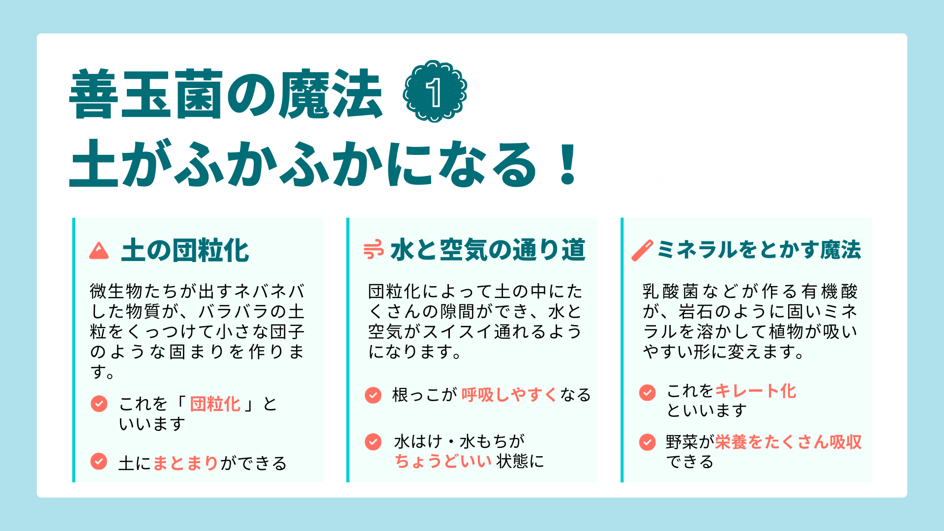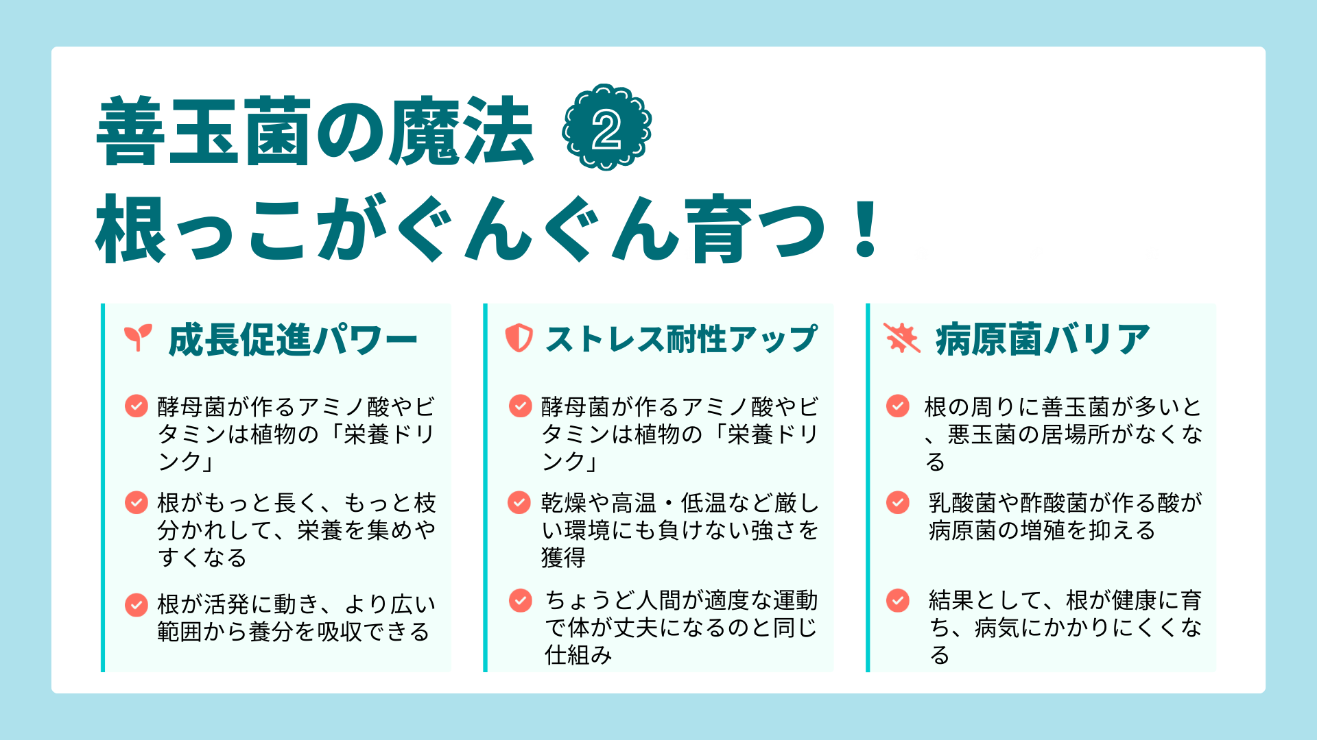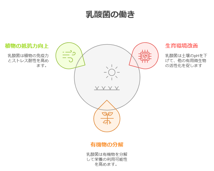 乳酸菌・酢酸菌が出す有機酸は土壌環境の改善や、植物を外的環境要因から保護する役割があります。