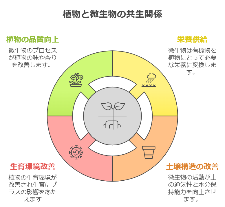 土壌微生物が活性化し善玉菌が優位な環境を作ることにより、植物が育ちやすい環境作りをサポートします。