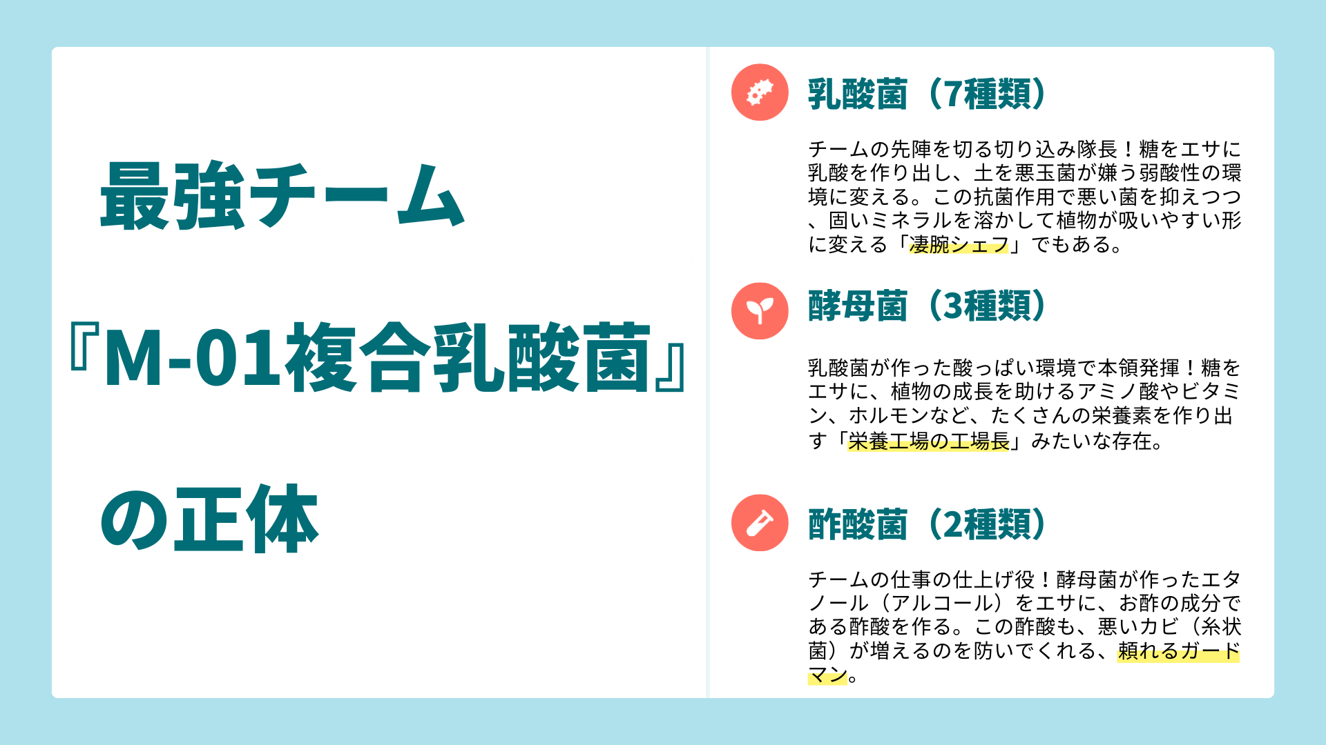 菌資材の基になる種菌は、ドクダミ、緑茶、黒高麗人参などの天然薬草を独自の発酵技術で生産されています。この種菌を培養して製造されたM-01複合乳酸菌は、乳酸菌・酵母・酢酸菌・枯草菌など様々な有用微生物を主体とした植物由来の微生物資材です単一属生菌資材とは違い複数の異なる菌種が存在することで、相乗効果が生まれ農産物が育ちやすい環境へと導きます。
