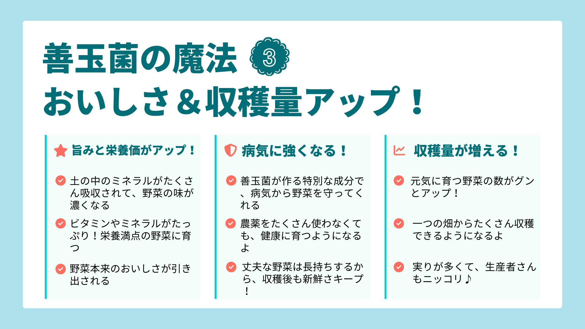 有用微生物の働きで植物が生育しやすい環境に改善し、作物の秀品率・収穫量がアップします。